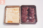 | 3. | Place the bonito 1 and the tofu 2 into two separate deep trays and add half of the marinade mixture made from the ingredients in gAh to each tray. Place trays in a refrigerator to chill for 15-20 minutes, turning over at regular intervals to allow the marinade to soak in.![]() |